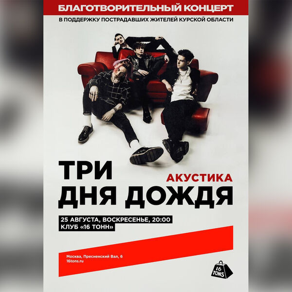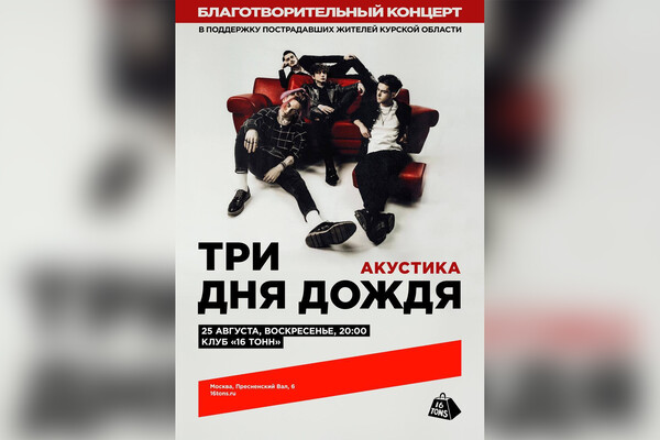 Группа «Три дня дождя» сыграет благотворительный концерт в московском клубе «16 Тонн» в поддержку пострадавших в Курской области. Об этом сообщает пресс-служба музыкального коллектива.