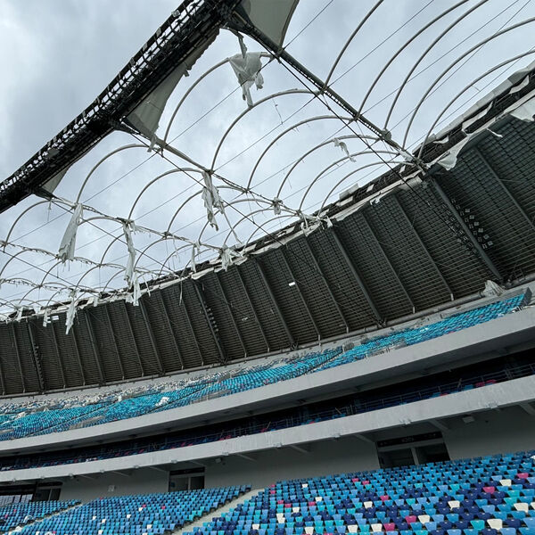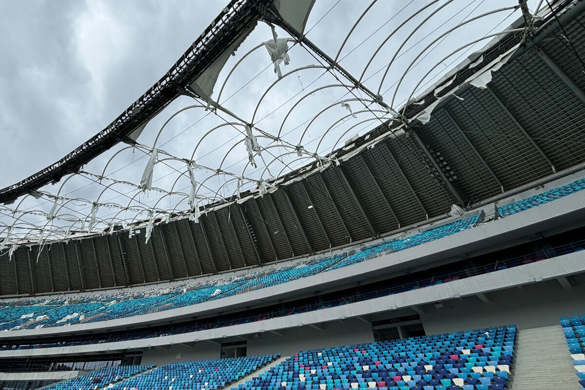 Согласно публикации, супертайфун сорвал и повредил большую часть крыши, под которой должны были размещаться зрители. Фрагменты ее панелей ветер разбросал по полю и территории спортивного комплекса.