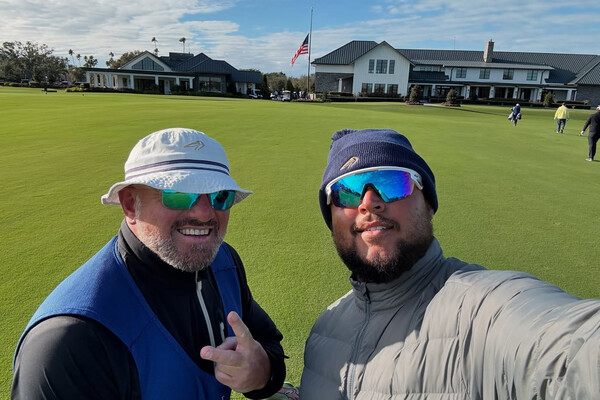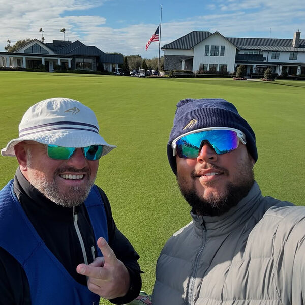 30-летний Коннор сфотографировался с другом на поле для гольфа.