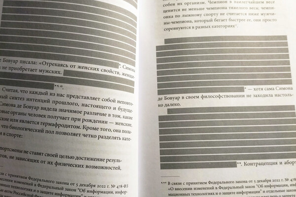 Агрыцкова сопроводила пост фотографией страниц, на которых видно, что издательство выпустило книгу с закрашенными цитатами Симоны де Бовуар. Пояснение внизу страниц гласит, что причиной подобного решения издательства стало требование закона о запрете «пропаганды нетрадиционных отношений и смены пола».
