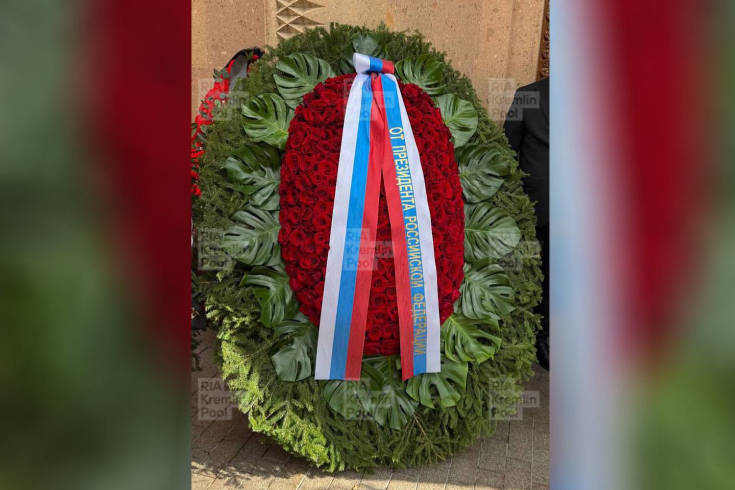 Венок, состоящий из красных роз, украшен лентой-триколором с надписью «От президента Российской Федерации».
