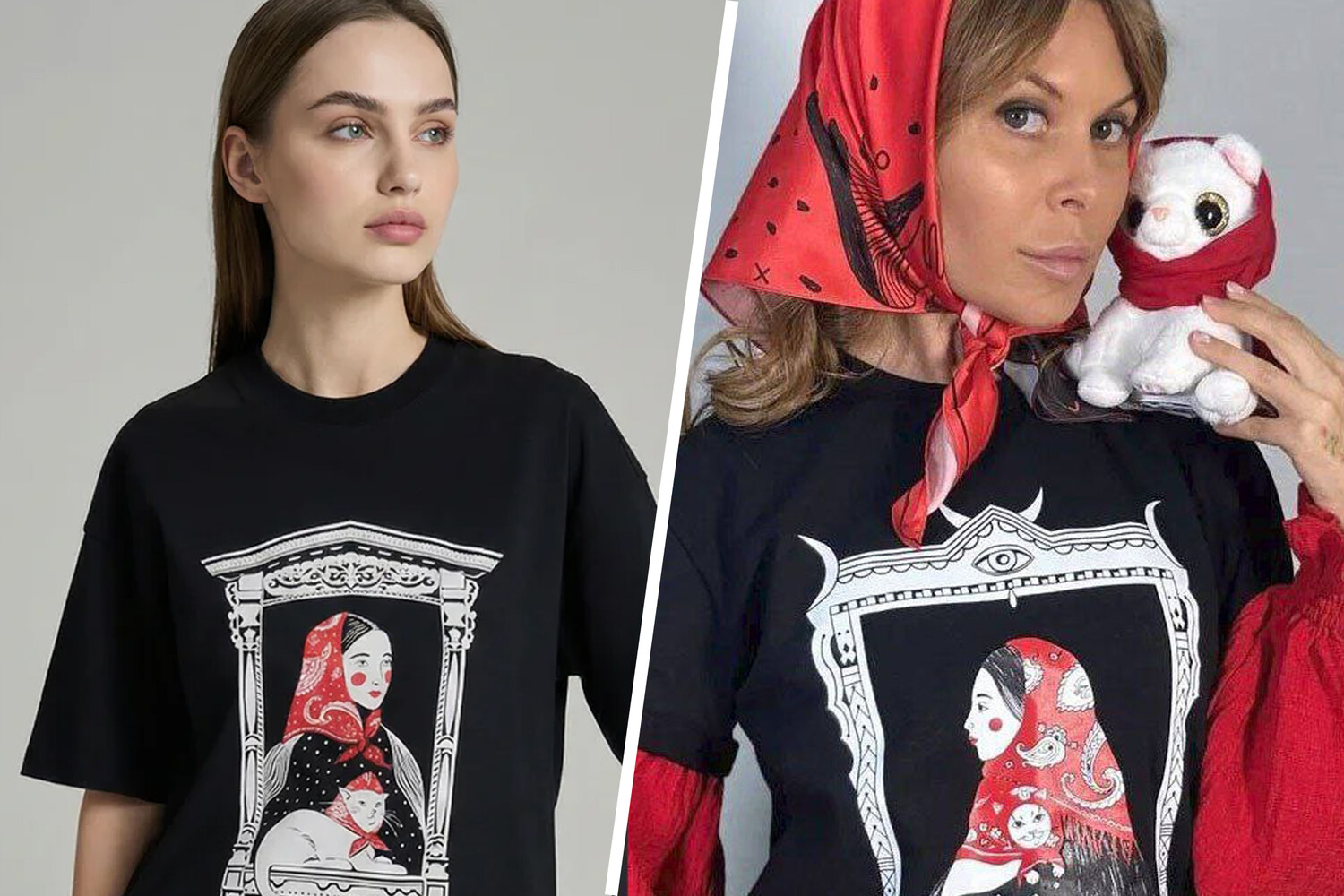 Яне Антоновой одна из футболок — с девушкой, наличниками и котом — напомнила ее работу, созданную в коллаборации с другим брендом в 2023 году. Максим Алибеков, в свою очередь, нашел один из принтов схожим со своей работой «Коды России» — стилизованным триколором, созданным в начале июня 2025 года.