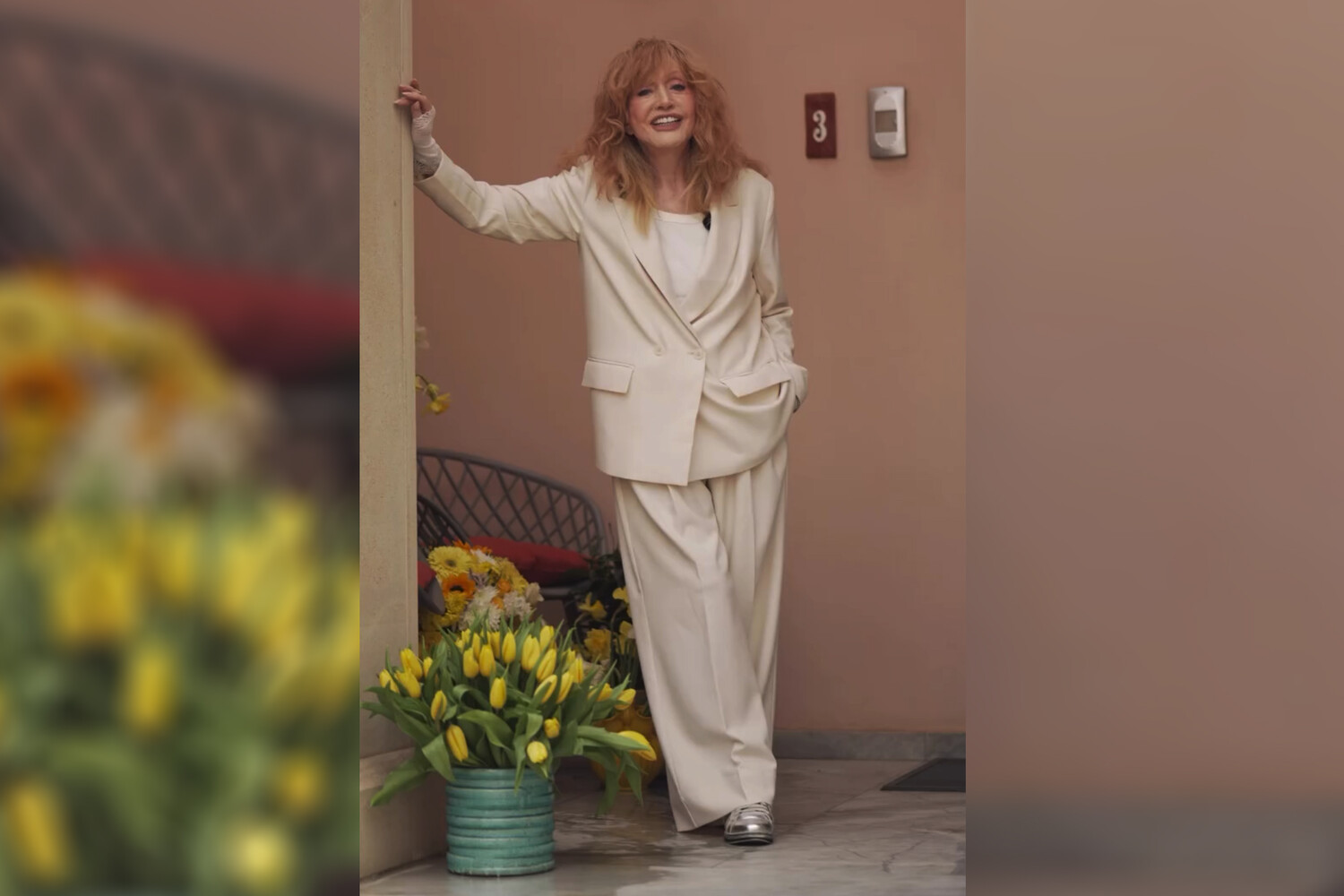 Пугачева сняла ролик в белом наряде среди цветов.