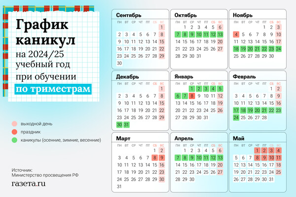 Какая бы система обучения ни действовала в школе — по четвертям или по модулям — периоды учебы и отдыха должны равномерно чередоваться, а каникулы не могут длиться меньше семи дней. Более точный график учебы и отдыха школьников появится после того, как будет утвержден производственный календарь на 2025 год, пока он существует в виде проекта.
