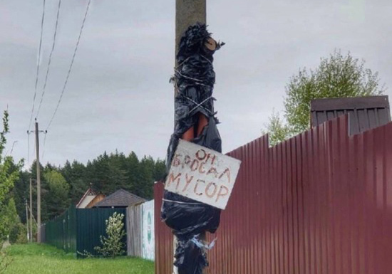Чучело напоминает человека, завернутого в мусорные пакеты и привязанного вниз головой к фонарному столбу. К чучелу жители привязали табличку со словами, написанными красной краской: «Он бросал мусор».