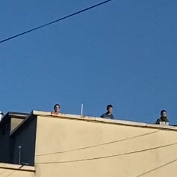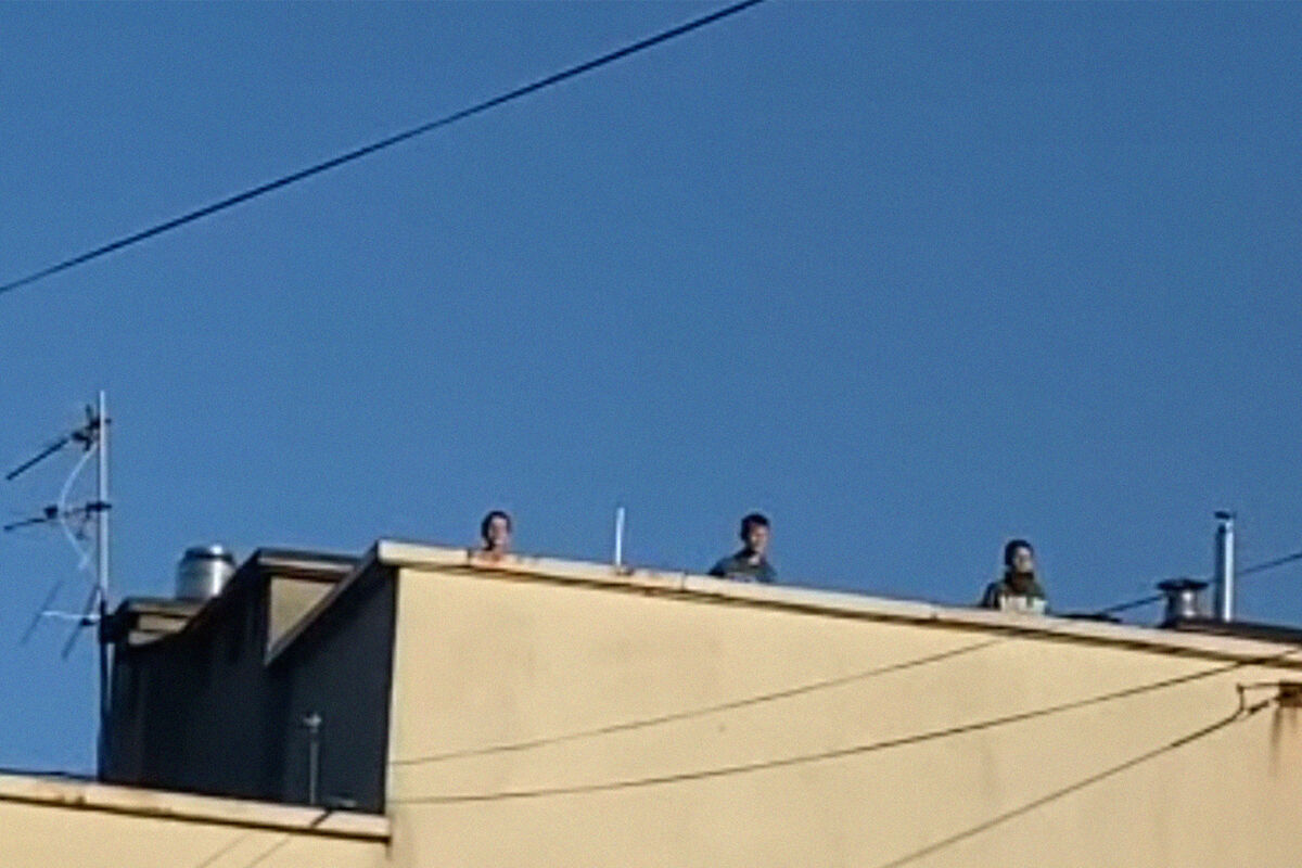 Женщина с ребенком предупредила прохожих о том, что с крыши скидывают камни и сняла мальчиков на видео. Подростки услышали предупреждение девушки о съемке и убежали с крыши многоэтажного дома.