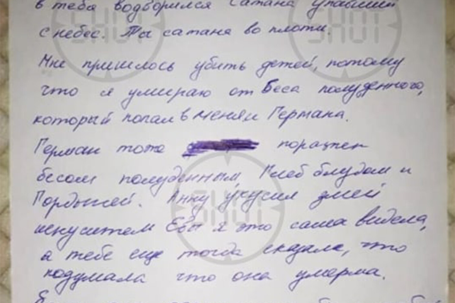 «Мне пришлось убить детей, потому что я умираю от беса полуденного. В тебя водворился Сатана. Сыновья поражены бесом, блудом и гордыней. Дочь укусил Змей-искуситель», — говорится в оставленной женщиной записке.