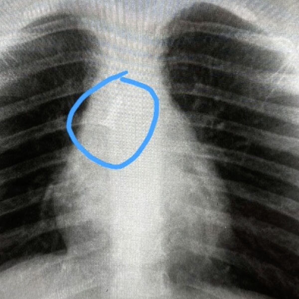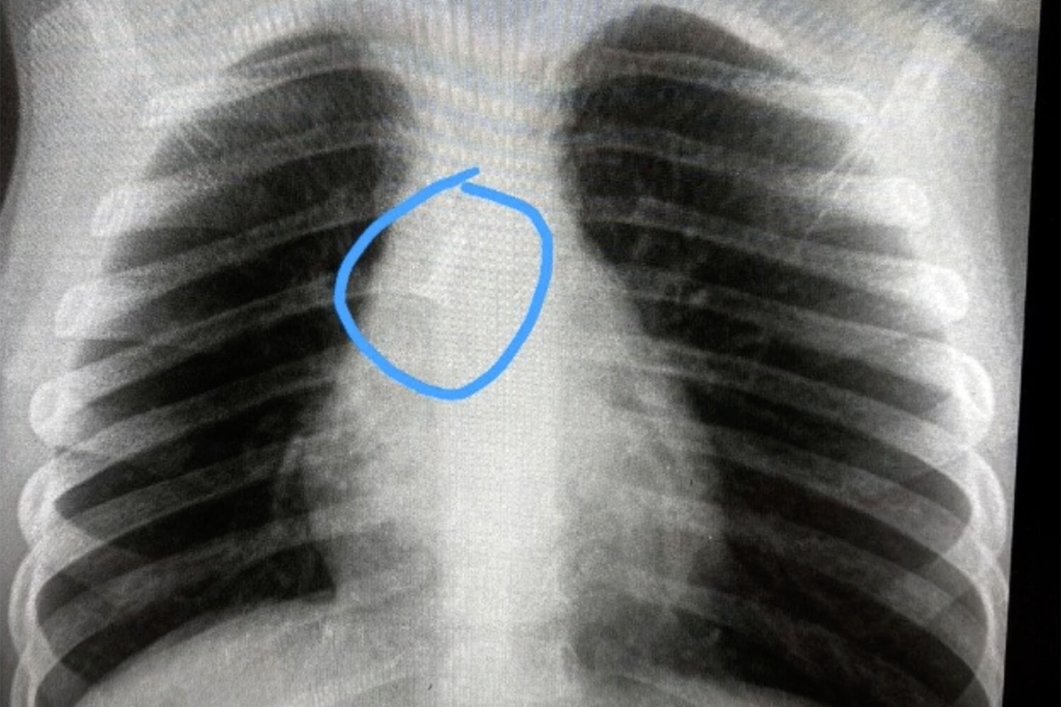 В больницу трехлетнего ребенка привезли на «скорой». Его родители рассказали, что ребенок во время игры вдохнул саморез. Через некоторое время у дошкольника повысилось слюноотделение и появился кашель. Взрослые обратились за медицинской помощью.