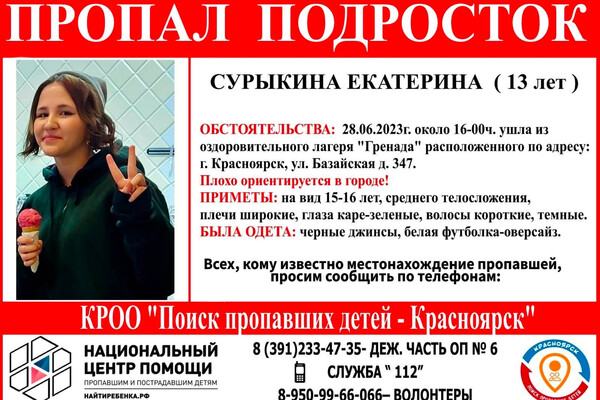 В Красноярске разыскивают 13-летнюю девочку, пропавшую из оздоровительного лагеря
