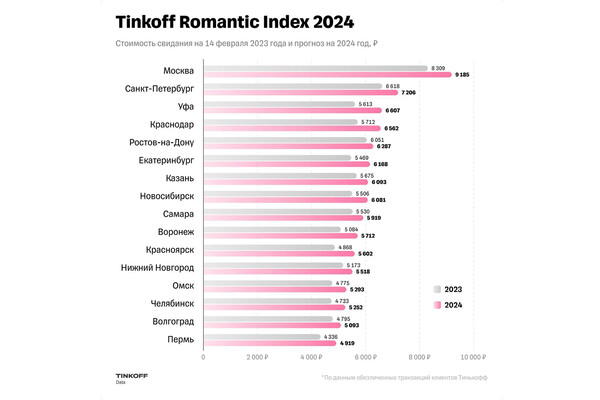Для москвичей свидание на 14 Февраля обойдется дороже всего — 9185 рублей. Жители Санкт-Петербурга и Уфы потратят на свидание в среднем 7206 и 6607 рублей соответственно. В пятерку лидеров по стоимости свидания также вошли Краснодар и Ростов-на-Дону, где индекс составит 6562 и 6287 рублей соответственно. Жителям Перми по-прежнему дешевле всего обходится отметить праздник — стоимость среднестатистического свидания составит 4919 рублей.