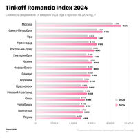 Так, в 2024 году стоимость свидания вырастет на 10% по сравнению с предыдущим годом и составит 6094 рублей. При этом инфляция в России за 2023 год, по данным Росстата, составила 7,42%. За последние 5 лет Tinkoff Romantic Index вырос на 42%.