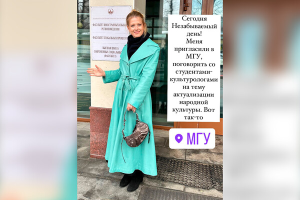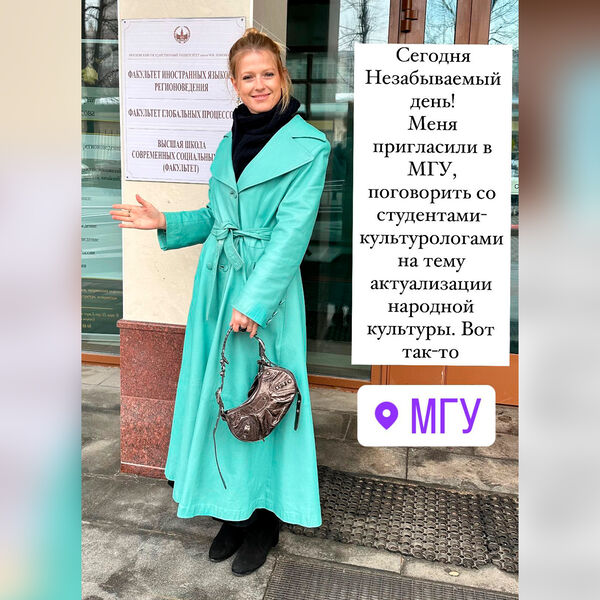 «Незабываемый день! Меня пригласили в МГУ поговорить со студентами-культурологами на тему актуализации народной культуры. Вот так-то. Необычно оказаться «по ту сторону баррикад». Хочу, чтоб об этом узнали все, кто когда-либо говорил, что я тупая», — высказалась артистка.