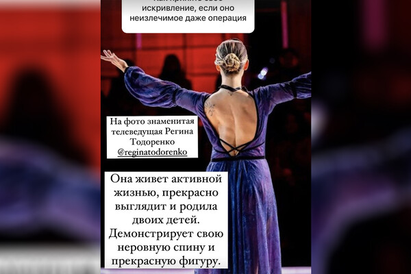 Телеведущая Регина Тодоренко призналась в личном блоге, что ее раскритиковали за принятие себя. Знаменитости посоветовали лучше работать над своей «кривой» спиной из-за сколиоза. Артистка показала сообщение, которое получила от подписчицы.