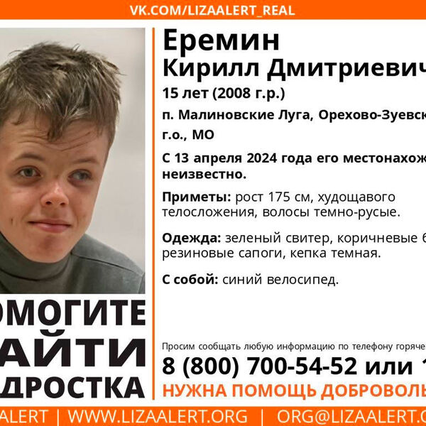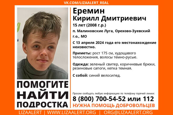 В Московской области с 13 апреля идут поиски 15-летнего Кирилла Еремина, который пропал под Орехово-Зуево. Об этом сообщил председатель поискового отряда «ЛизаАлерт» Григорий Сергеев на своей странице во «ВКонтакте».