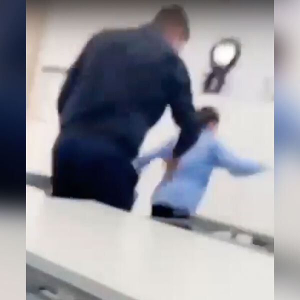 На кадрах мальчик в синей рубашке материться в классе при педагоге, после чего тот хватает его сзади за шею со словами «Ты чего? Язык вырос что ли?!»
