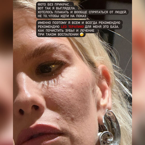 «Фото без прикрас. Вот так я выглядела. Хотелось плакать и вообще спрятаться от людей, а не то, чтобы идти на показ. Просто ужас. Не надо шеймить только, мы все люди. Сейчас кожа почти идеальная. Воспаления снял зеленый свет в LED-маске. Он хорошо помогает при розацеа. Видимо, это оно и было», — отметила звезда.