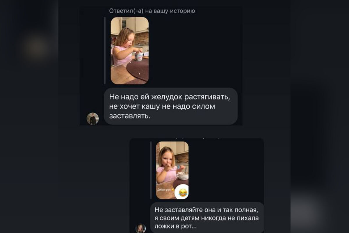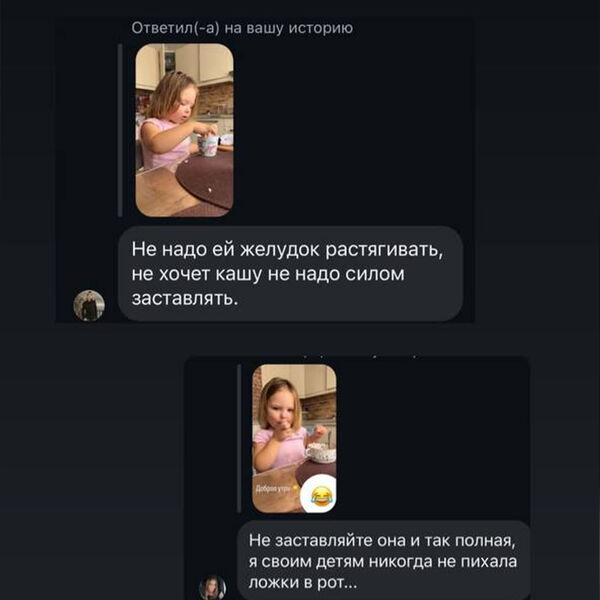 «Вы реально думаете, что я заставляю ребенка есть? Серьезно? Она съела 2 ложки каши. И на протяжении дня не ест почти ничего, кроме овощей и фруктов. Ее сейчас сложно накормить. И я растягиваю ей желудок? Господи, дай мне сил», — высказалась артистка.