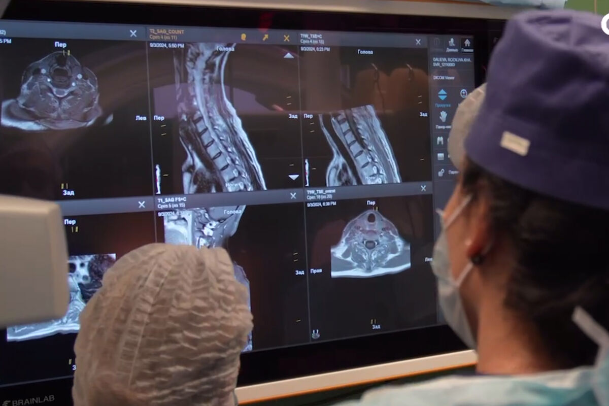 «Первым этапом мы выполнили удаление опухоли из тела шейного позвонка. Затем мы убрали этот шейный позвонок, задние его структуры и зафиксировали этот уровень. Также мы подготовились к третьему этапу лечения — зафиксировали уровень грудной, для того чтобы в следующий раз удалить тело грудного позвонка, в котором есть опухоль», — рассказал хирург Антон Кордонский.