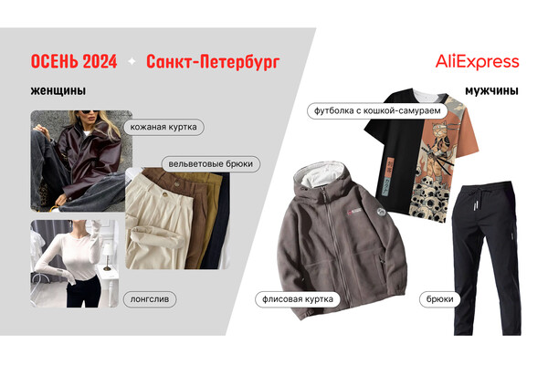 Осенние луки жительниц Санкт-Петербурга характеризуются смешением классики и современных трендов. В гардеробе нашлось место кожаным курткам в традиционном черном цвете, которые остаются вечной классикой. В качестве основы женщины выбирают лонгсливы и свитера с добавлением шерсти, а также теплые свитшоты с забавными принтами. Мужчины из Санкт-Петербурга в этом сезоне отдавали предпочтение функциональному стилю с элементами уличной моды. В их гардеробах преобладают флисовые куртки, обеспечивающие тепло и комфорт, а также футболки с японскими мотивами, например, с изображением кошек-самураев. Завершает картину тренд на брюки-карго, удобные и практичные для активного образа жизни.