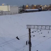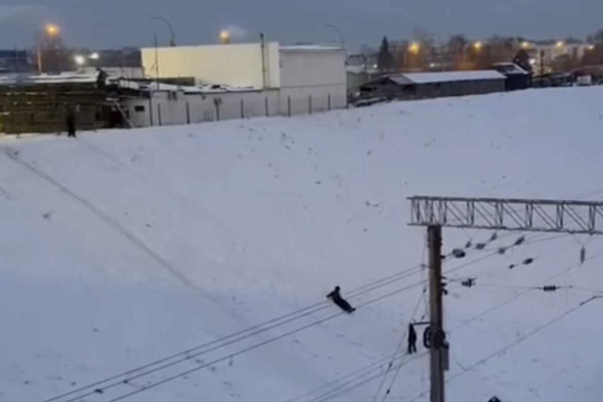 На кадрах трое детей-школьников катаются со снежного склона у торгового центра «Пионер» — стихийная горка заканчивается в нескольких метрах от дороги, по которой ходят поезда.