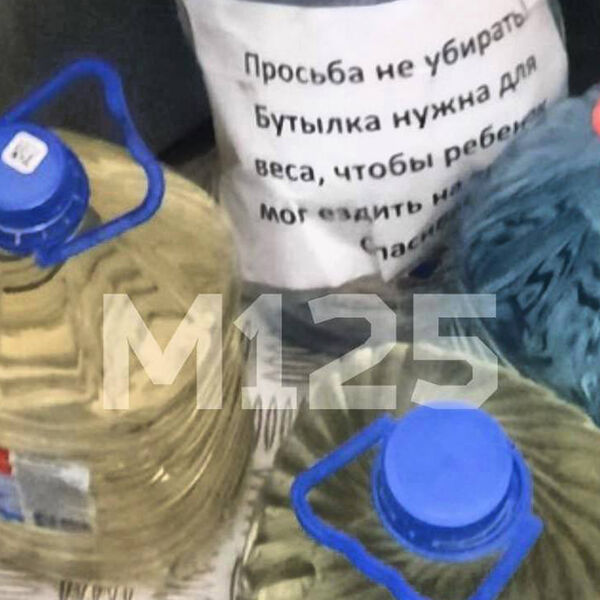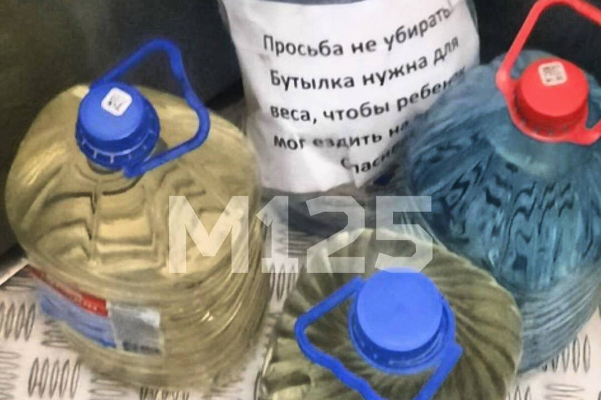 «Бутылка нужна для веса, чтобы ребенок мог ездить на лифте. Спасибо», — гласит сопроводительная записка, примотанная к одной из пятилитровок.