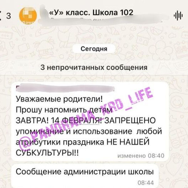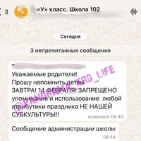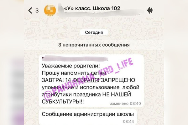 «Уважаемые родители! Просим напомнить детям завтра! 14 февраля! Запрещено упоминание и использование любой атрибутики праздника не нашей субкультуры», — говорится в сообщении.