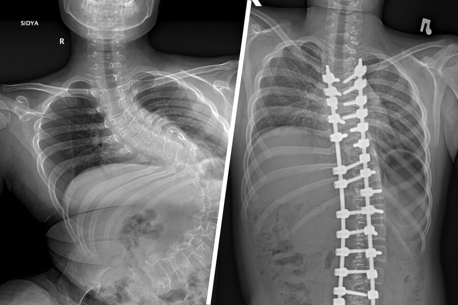 Вмешательство длилось четыре часа: за это время ребенку скрепили позвоночник металлической конструкцией, скорректировав деформацию до 32 градусов.
