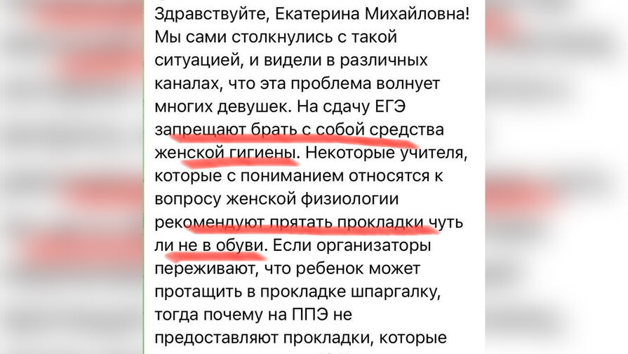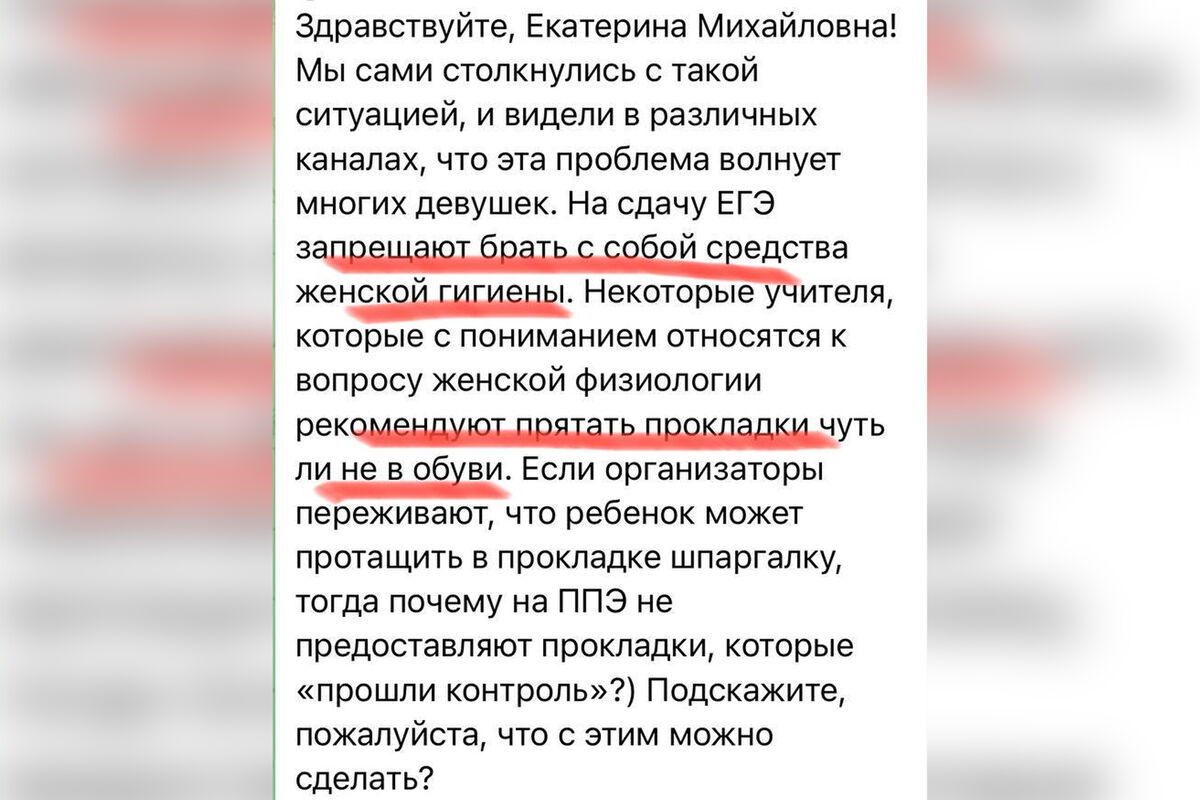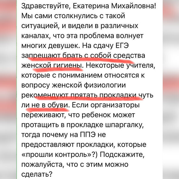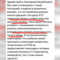 Общественница опубликовала сообщение одной из девушек, которая столкнулась с подобной проблемой. Школьница посетовала, что им не дают брать на ЕГЭ прокладки, а также сослалась на рекомендации понимающих учителей «прятать прокладки чуть ли не в обуви».