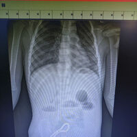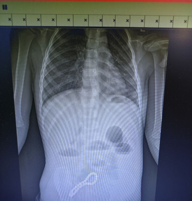 Ребенок попал в больницу с жалобами на проблемы с пищеварением. Медики предположили наличие в ЖКТ инородного тела, что подтвердил рентген.