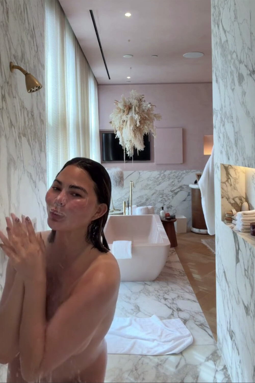 Звезда обложек Maxim Крисси Тейген снялась полностью обнаженной. Супермодель позировала в ванной и поделилась откровенными кадрами в Instagram (владелец компания Meta признана в России экстремистской и запрещена). Она стояла под душем, показывая свою утреннюю бьюти-рутину.