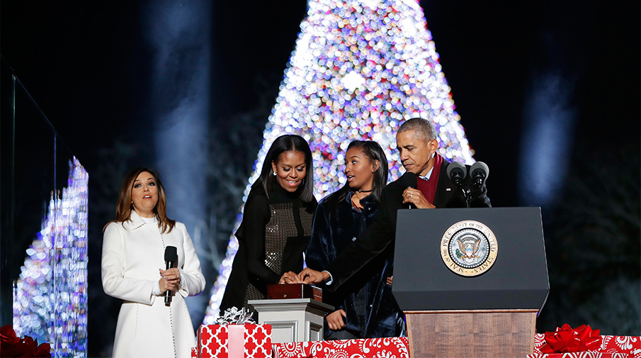 Президент США Барак Обама, его супруга Мишель и их младшая дочь Саша приняли участие в церемонии зажжения огней на главной елке страны, сообщает ET Online. Акция проходила в Вашингтоне.
