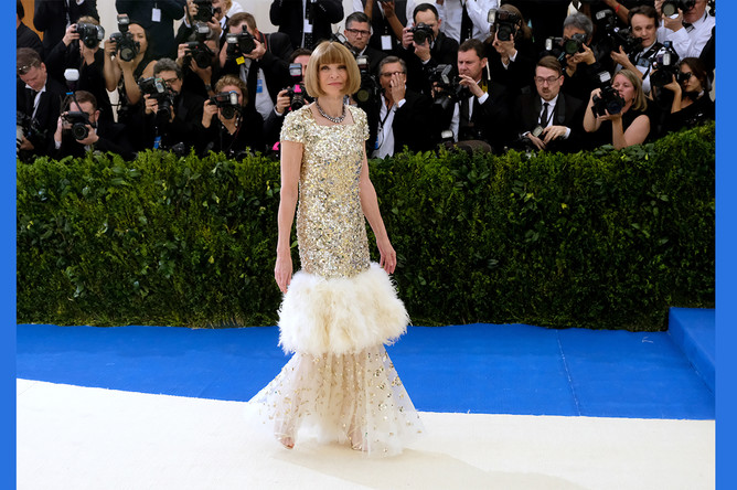 В шесть вечера по нью-йоркскому времени на бежевой ковровой дорожке появилась главный редактор американского Vogue Анна Винтур. На самой влиятельной женщине в американской модной индустрии красовалось сверкающее платье цвета шампанского в крупных пайетках. Подол платья состоял из тюля, также расшитого сверкающими деталями. Основным акцентом платья Chanel стал участок от бедра и до колена, выполненный из белоснежных перьев.