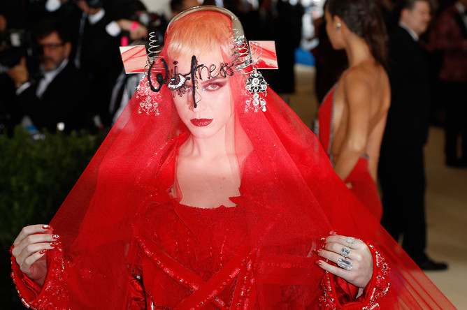 Певица Кэти Перри появилась на дорожке в эксцентричном красном наряде, созданном Джоном Гальяно для дома Maison Margiela Artisanal. Воздушная тюлевая юбка, украшенная тканевыми цветами, и вуаль, закрепленная черной короной — единственной контрастной составляющей образа, — трехметровый шлейф от вуали, красный же массивный пиджак.