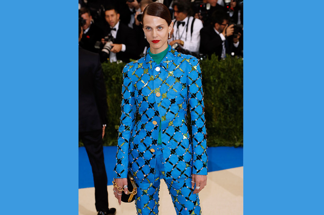 Первый женский брючный костюм на мероприятии этого года представила французская модель Эймелин Валад. Жакет и брюки насыщенного небесно-голубого цвета с блестящей аппликацией из переливающихся геометрических узоров, несомненно, отличались от классических «голливудских» платьев, в которых пришли такие популярные модели, как Кэндис Свейнпол и Бехати Принслоо-Левин.