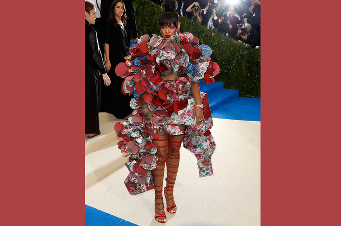 Певица Рианна уже традиционно поражает своим внешним видом, перенося тематику Met Gala на совершенно иной уровень. Кажется, будто она принимает заявленную стилистику мероприятия чересчур серьезно. Однако в 2017-м певица сочеталась с коллегами по цеху. Ни один другой дизайнер не смог бы отразить авангардный подход к цветам розы как к главному атрибуту дизайна музея Metropolitan так, как это сделали в Comme des Garçons. Основную задумку шоу Рианна перенесла непосредственно на себя: исполнительница облачилась в цветочный наряд, состоящий из десятков круглых и овальных текстильных деталей.