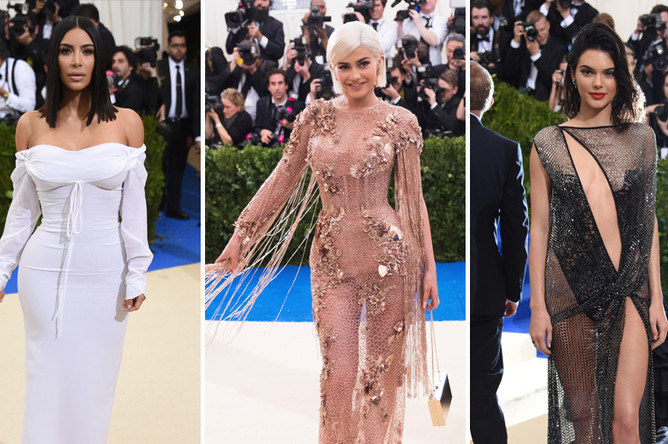 Близкие к семье Кардашьян-Уэст источники 1 мая рассказали порталу E!News, что главы семьи на мероприятии не будет. Рэпер Канье Уэст принял решение остаться дома с детьми в Лос-Анджелесе, однако его супруга Ким Кардашьян-Уэст на балу была не одна, а в компании сестер. На звезде было очень простое облегающее белоснежное платье Vivienne Westwood. Образ не был дополнен ни украшениями, ни другими аксессуарами. Младшая из клана Кардашьян-Дженнер — Кайли — дефилировала в прозрачном сетчатом платье Versace, которое было расшито ракушками и прочими предметами морского декора.