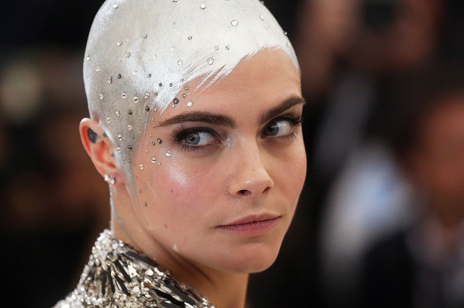 Знаменитая топ-модель Кара Делевинь нашла необычный способ привлечь внимание фотографов. Кара дополнила свой сияющий серебром брючный костюм Chanel не менее сияющей прической: новоиспеченная актриса и писательница, а точнее — ее голова, была обрызгана серебряной краской. Стойкое ощущение купальной шапочки не сделало образ менее стильным, но совершенно точно перетянуло на себя внимание публики.