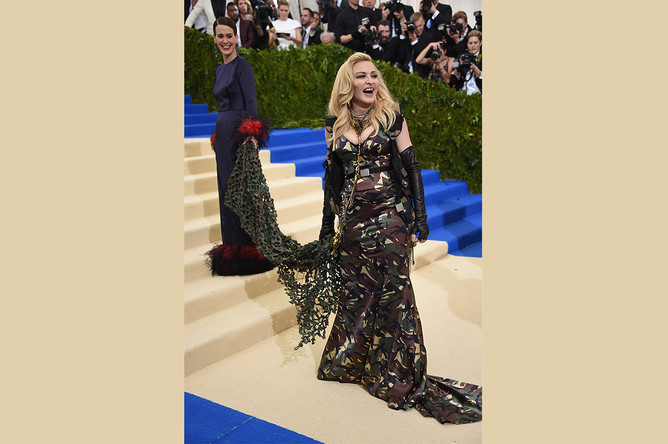Невозможно описывать праздник Института костюма без ее фактического постоянного хедлайнера — Мадонны. Эпатажная певица снова умудрилась удивить видавший, наверное, всё американский бомонд. В этот раз Мадонна посетила Met Gala в камуфляжном платье, шлейфом которого служила военная сеть.