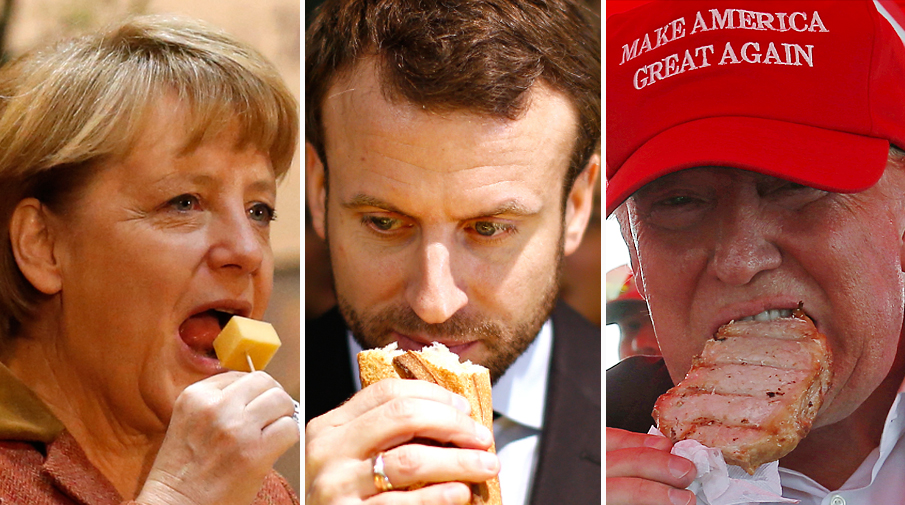 Канцлер ФРГ Ангела Меркель с сыром, президент Франции Эммануэль Макрон с багетом и президент США Дональд Трамп с отбивной, коллаж «Газеты.Ru»