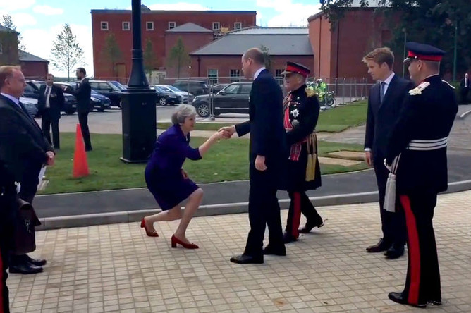 Премьер-министр Великобритании Тереза Мэй стала объектом насмешек в твиттере после того, как попыталась сделать реверанс перед принцем Уильямом, герцогом Кембриджским во время визита в недавно открывшийся реабилитационный центр в графстве Ноттингемшир.