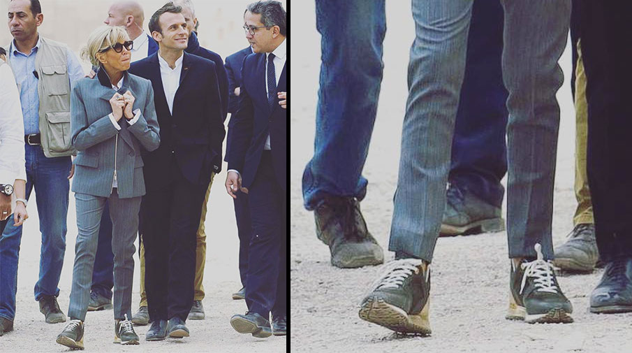 65-летняя супруга французского президента надела строгий серый костюм и пару кроссовок Louis Vuitton Run Away для визита храм в скале Абу-Симбел на западном берегу Нила.