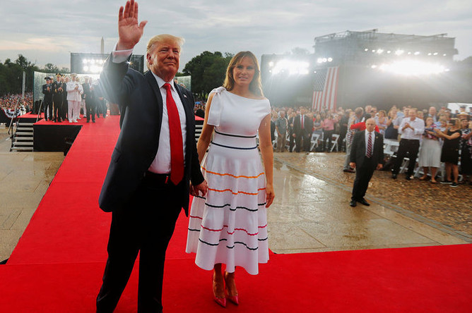 Над Меланьей Трамп снова издеваются в сети. На этот раз первая леди США заслужила порицание пользователей из-за того, что во время празднования Дня независимости вышла за руку с президентом в платье с «традиционными русскими орнаментами». По крайней мере, так выразились некоторые комментаторы в твиттере, которые во время трансляции праздничного салюта у мемориала Линкольна разглядывали на супруге Трампа белое платье американского бренда Carolina Herrera.