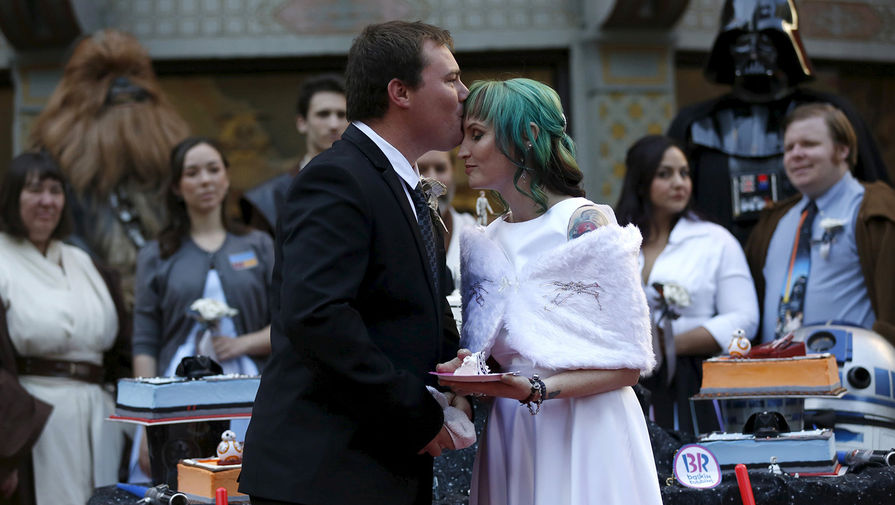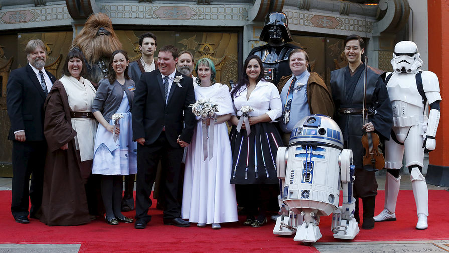 Поклонники культовой саги Эндрю Портерс и Кэролин Риттер решили отпраздновать премьеру седьмого эпизода «Звездных войн» необычным способом: пара связала себя узами брака. Событие произошло возле Китайского театра (TCL) в Голливуде. Чтобы попасть на показ ленты «Звездные войны: Пробуждение силы» одними из первых, Риттер и Портерс провели в очереди к кинотеатру почти две недели. Пара уже приезжала в США на премьеру фильма любимой саги. Это произошло в 2005 году, когда на экраны вышел эпизод «Месть ситхов».