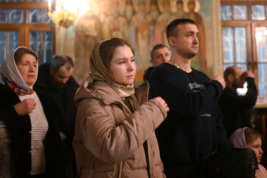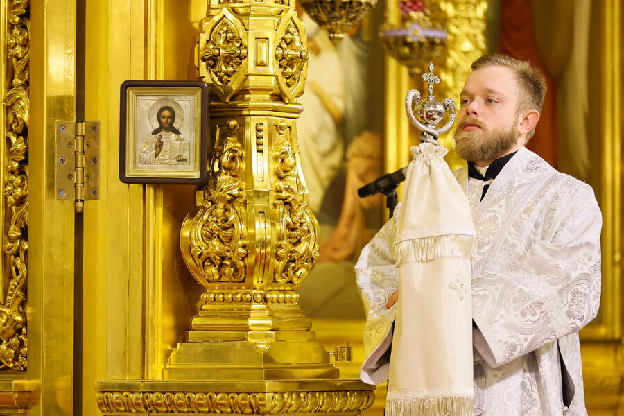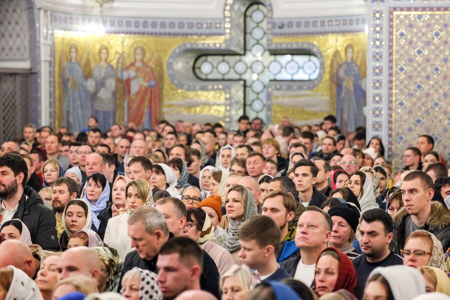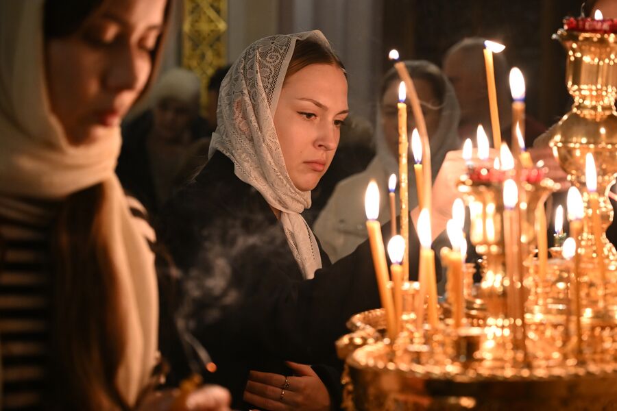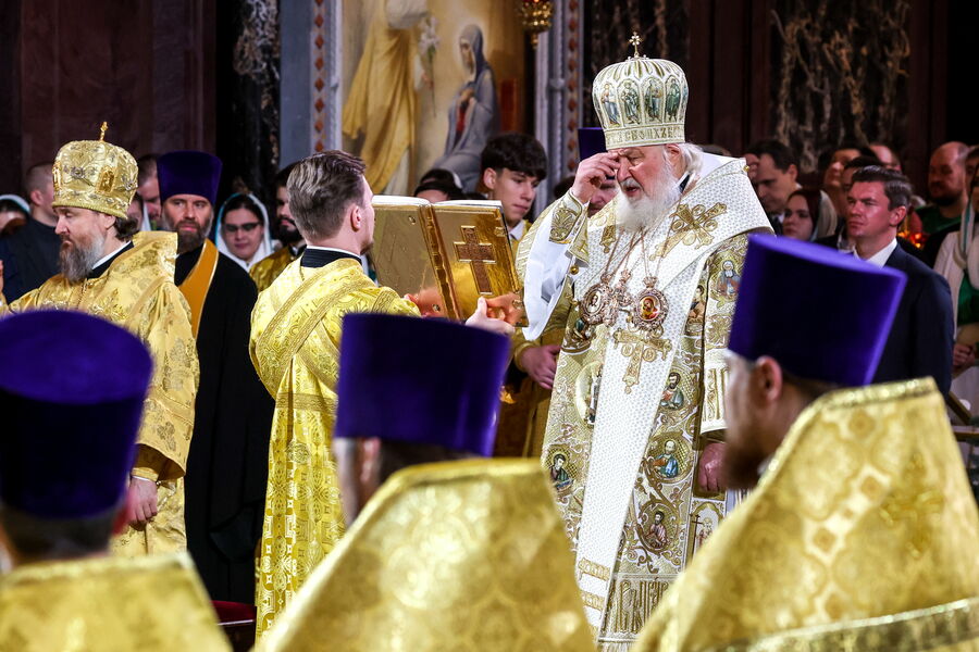 Патриаршее богослужение в храме Христа Спасителя в Москве, на которое собрались тысячи верующих, началось за час до полуночи и продолжилось до утра.