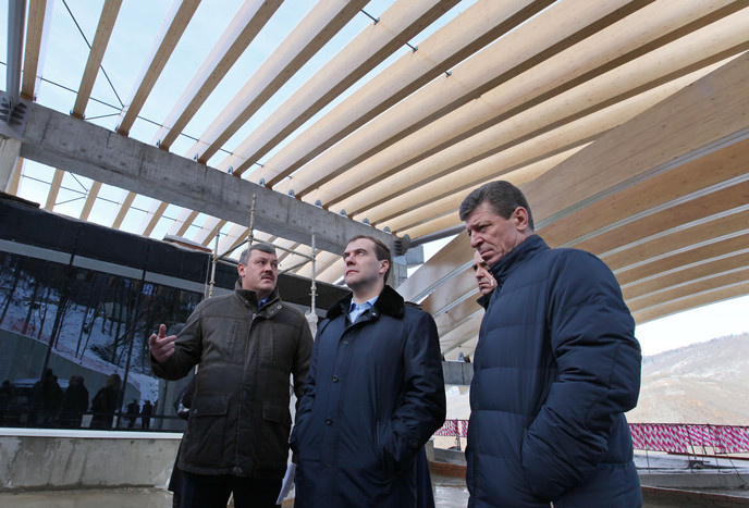 Президент РФ Дмитрий Медведев осматривает строящуюся трассу для сноуборда на горнолыжном курорте «Роза хутор» Медведев осматривает строящуюся санно-бобслейную трассу, на которой планируют проводить соревнования по бобслею, скелетону, санному спорту Поинтересовавшись, когда должна быть введена трасса, глава государства, получив ответ, что 20 февраля, заметил, что до этого срока времени осталось немного Совещание о ходе строительства олимпийских объектов в Сочи При осмотре объектов Медведева сопровождали зампредседателя правительства Дмитрий Козак, министр транспорта Игорь Левитин, а также глава министерства спорта, туризма и молодежной политики Виталий Мутко Дмитрий Медведев и Виталий Мутко