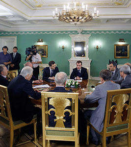 Встреча президента с партиями началась на полтора часа позже назначенного времени и длилась более двух часов. Большая часть встречи прошла за закрытыми дверями. В беседе принимали участие восемь партийцев (по два человека от каждой партии) и первый замруководителя администрации президента Владислав Сурков.
