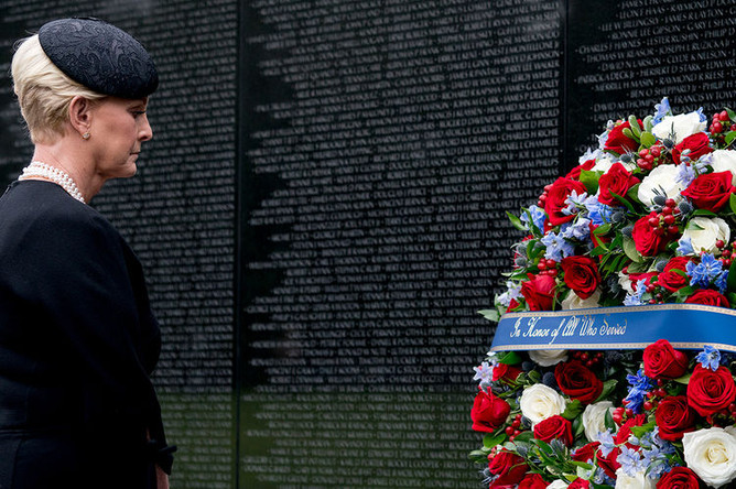 Тем временем, вдова Джона Маккейна в сопровождении министра обороны США Джейсса Мэттиса и других высокопоставленных чиновников проходит вдоль мемориальной стены, на которой высечены имена погибших во время войны во Вьетнаме, жертвой которой буквально чудом не стал сам Маккейн.