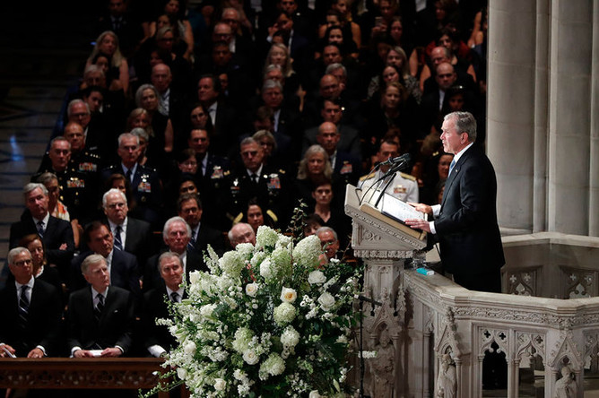 Несмотря на то что Буш и Маккейн в 2000 году были соперниками по праймериз, и Маккейн проиграл будущему президенту США, Джордж Буш-младший называет Маккейна своим другом и говорит, что уже скучает по нему. А также напомнил, что Маккейн сражался с «неправдой», и в этом ряду он перечислил Россию, Китай и Северную Корею.
