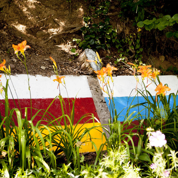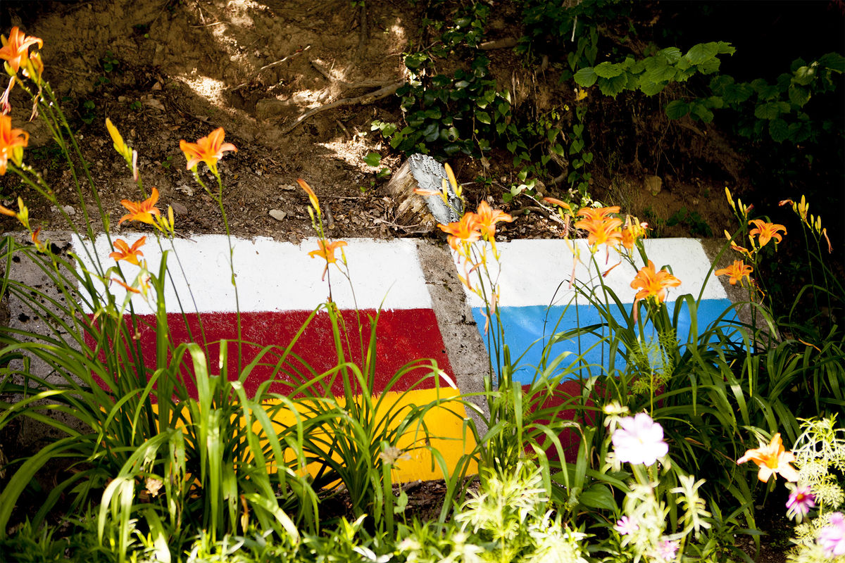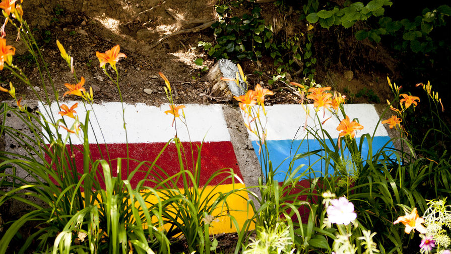 Нарисованные флаги Осетии и России на камнях оздоровительного комплекса «Нагутни» в Южной Осетии, 2017 год
