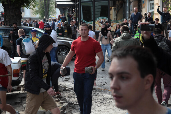 Впоследствии между сторонами завязалась перепалка, которая переросла в столкновения с использованием камней, петард и даже светошумовых гранат. Постепенно уличный бой сместился в сторону Куликова поля, где сторонники «евромайдана» начали громить палаточный городок своих противников. Несколько десятков человек попытались укрыться от нападавших в Доме профсоюза, но в итоге здание подожгли, забросав коктейлями Молотова и брусчаткой.
